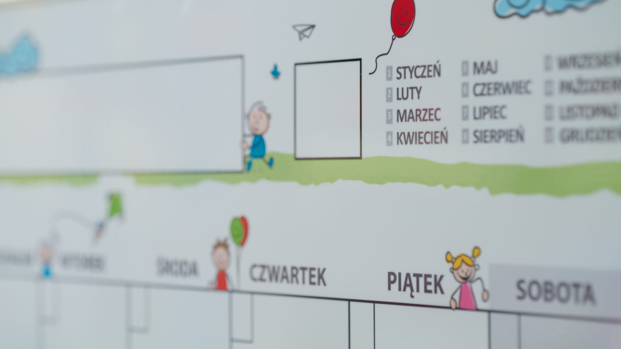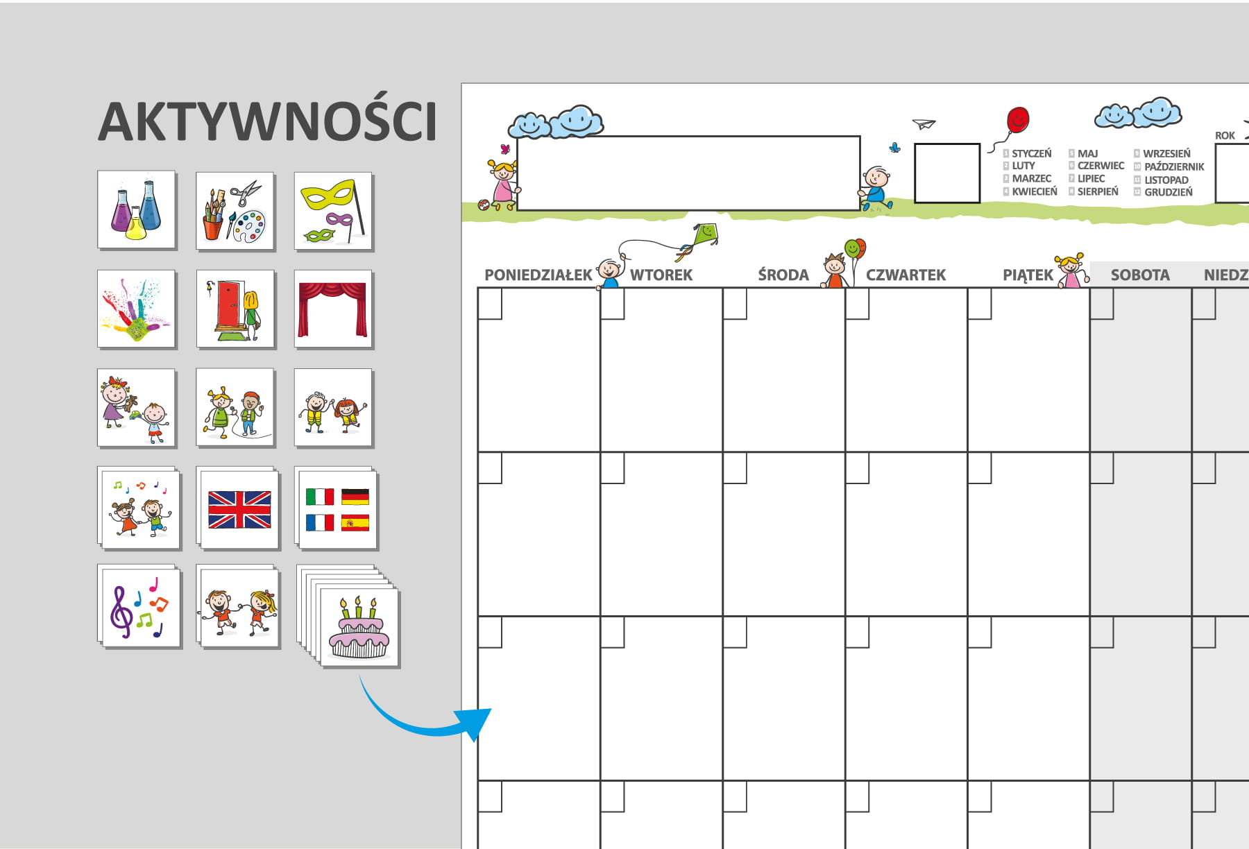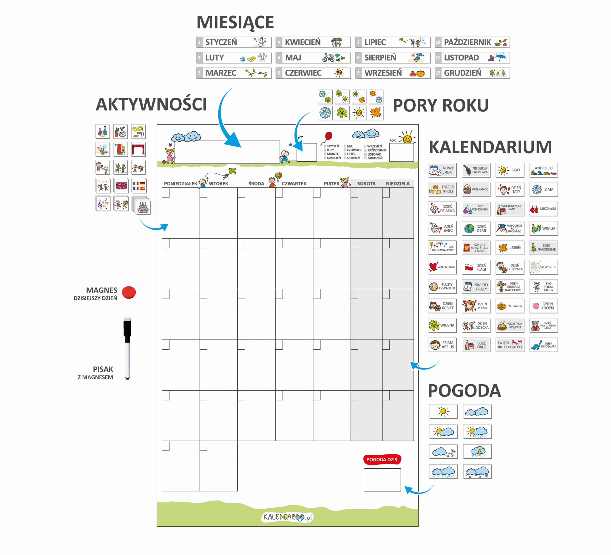 Kalendarz do przedszkola to mata dwustronnie magnetyczna, którą można zawiesić na dowolnej powierzchni magnetycznej. Kalendarz jest powierzchnią magnetyczną i suchościeralną, więc można na nim mocować magnesy, a także pisać po nim i ścierać go wielokrotnie.