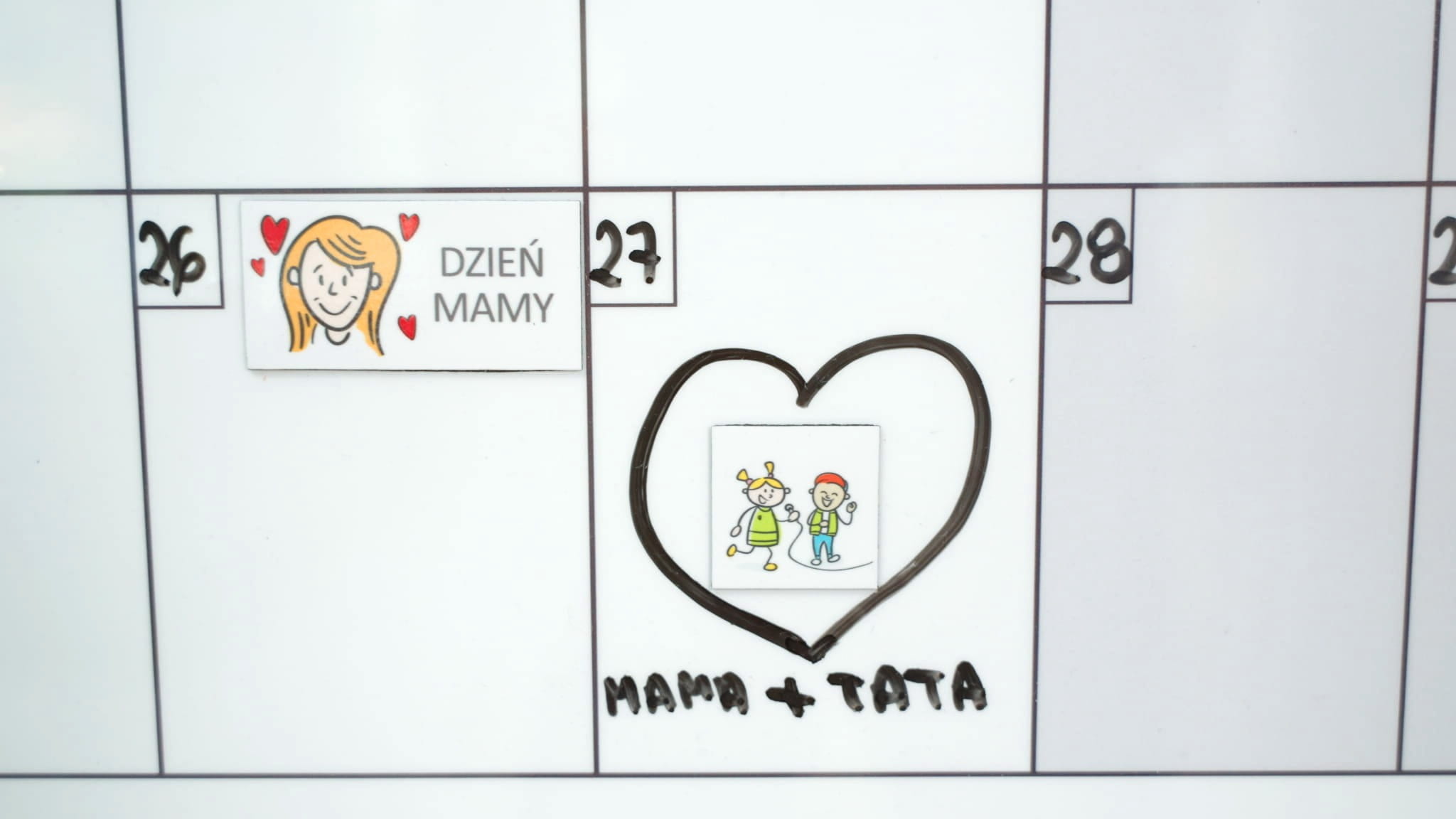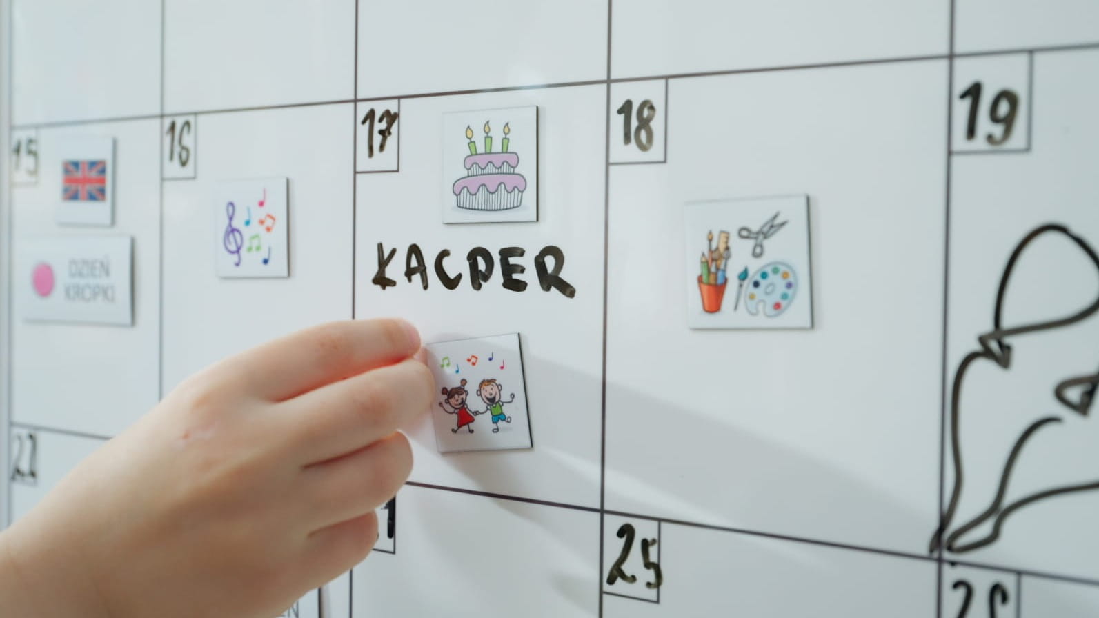 Uzupełniony kalendarz można bez problemu zdejmować z tablicy magnetycznej bez potrzeby ściągania magnesów i ponownie go zawieszać w niezmienionym stanie.