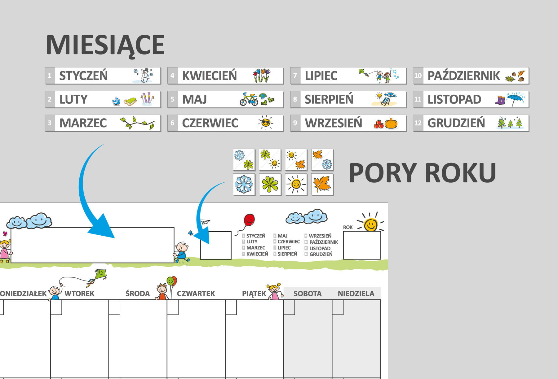 Kalendarz został zaprojektowany tak, aby mógł być używany wielokrotnie i służył w przedszkolu przez kolejne kilka lat.
