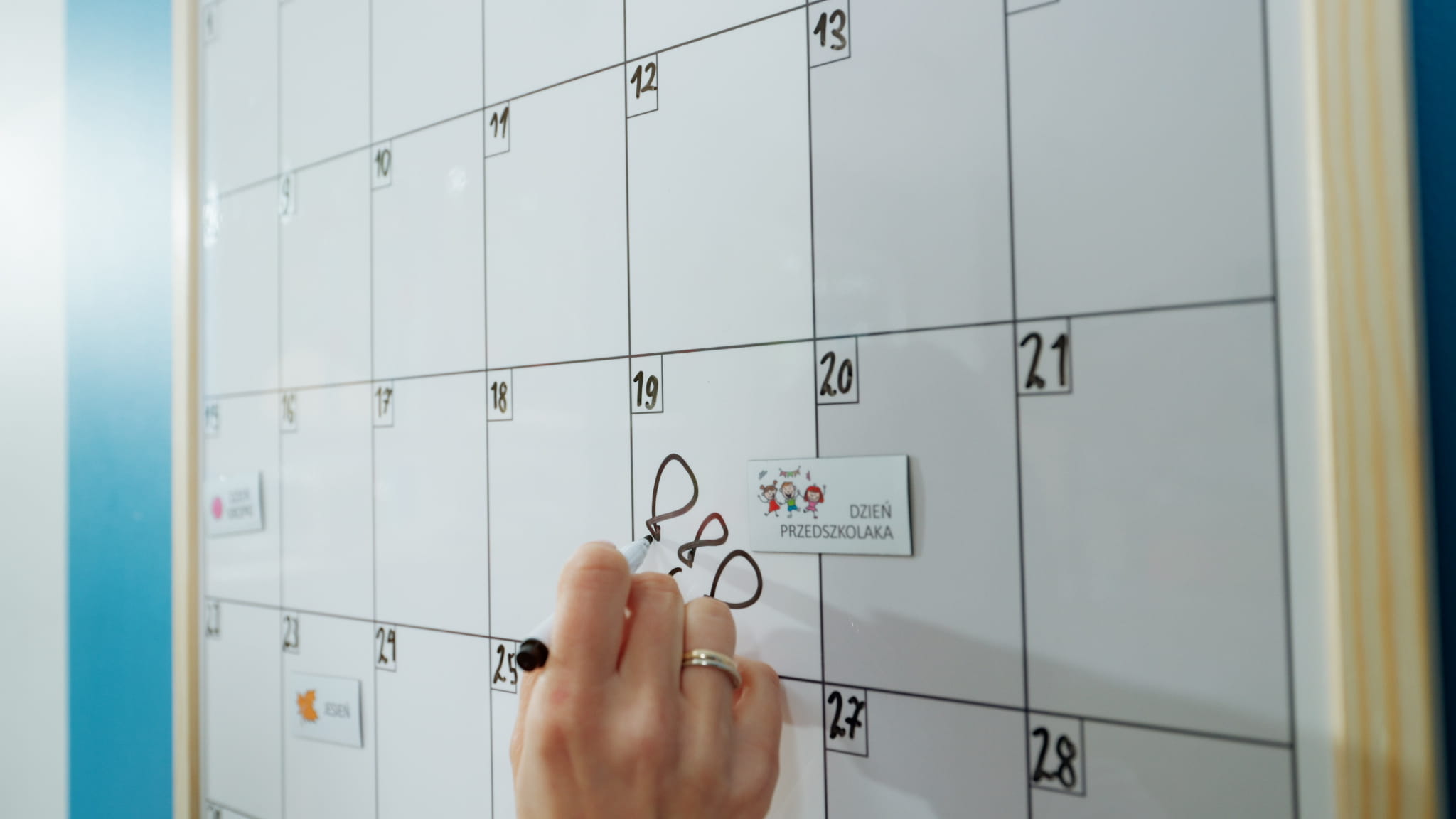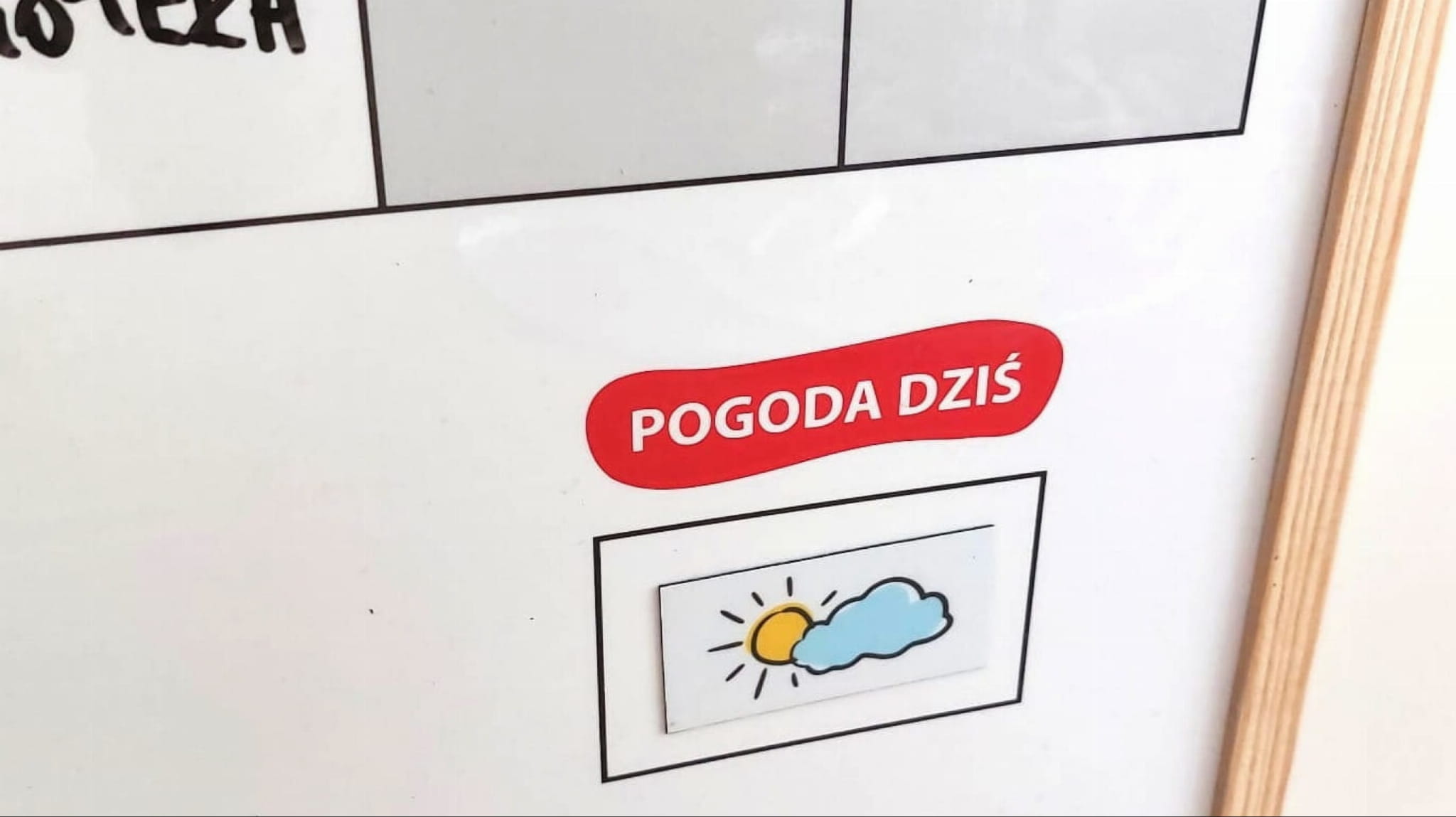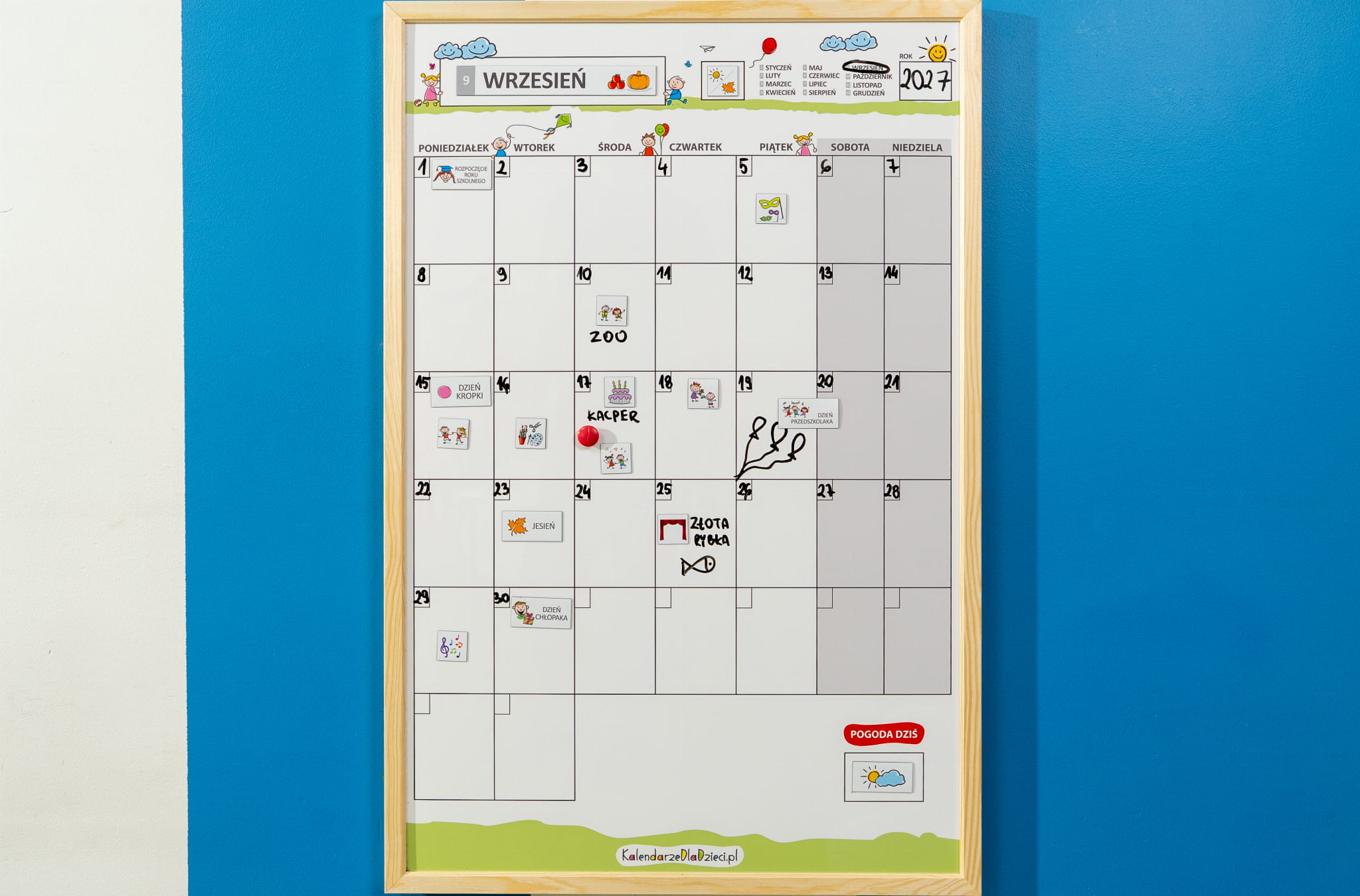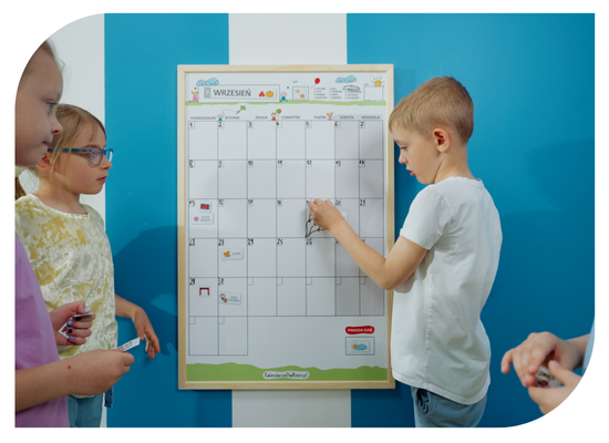 Kalendarz do przedszkola to tablica magnetyczna w drewnianej ramie, którą można zawiesić na ścianie. Kalendarz jest powierzchnią magnetyczną i suchościeralną, więc można na nim mocować magnesy, a także pisać po nim i ścierać go wielokrotnie.