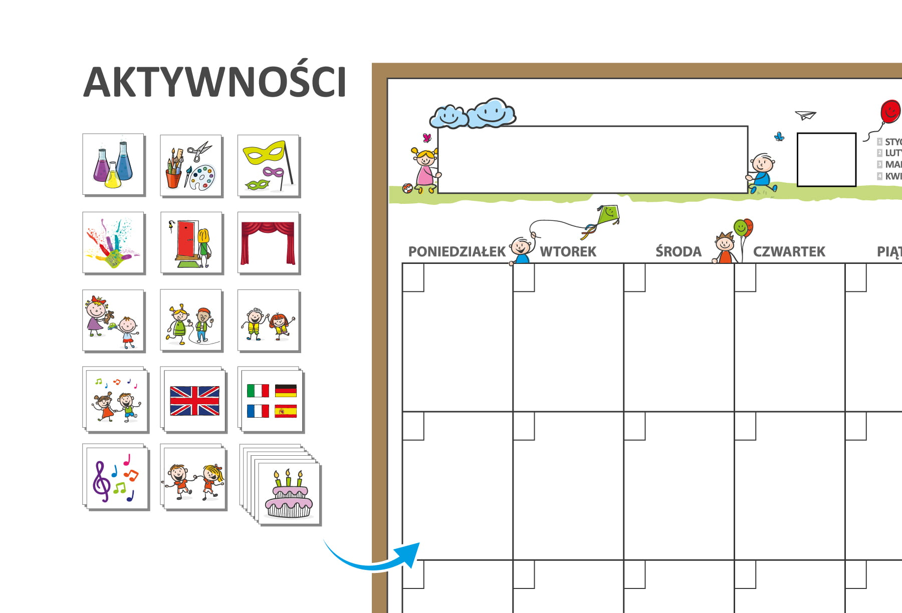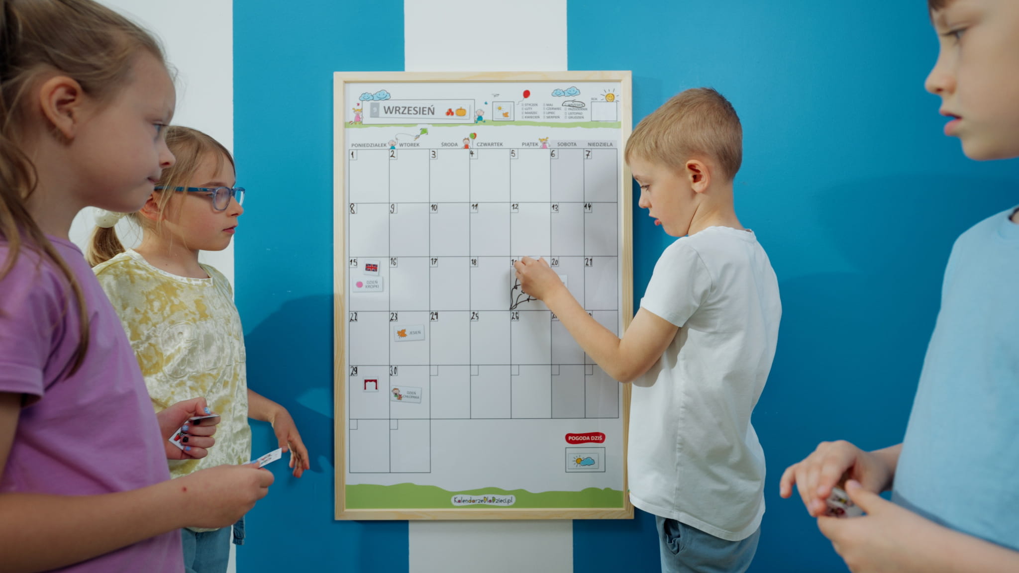 Kalendarz stanowi osobny element do zwieszenia na ścianie. Nie zajmuje tablic, które już są w sali.