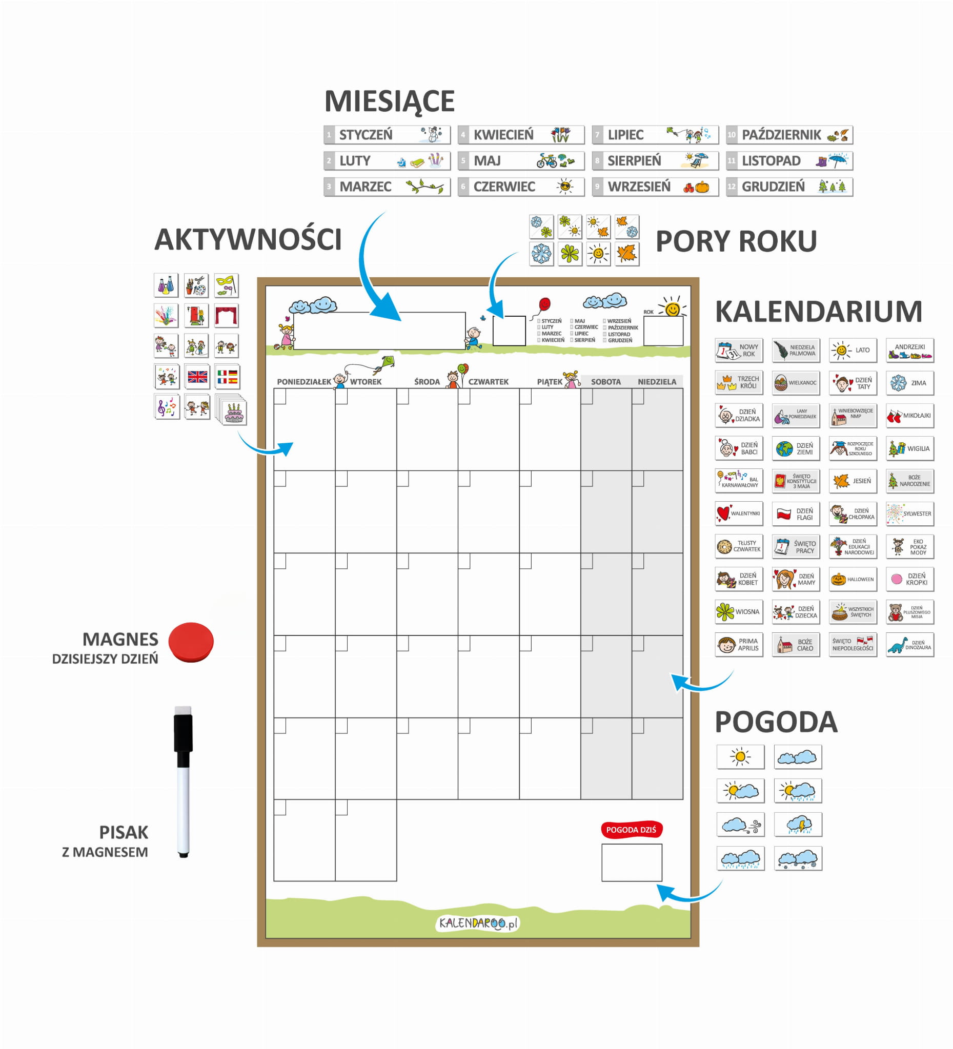 CO WYRÓŻNIA KALENDARZ DO PRZEDSZKOLA KALENDAROO W FORMIE TABLICY MAGNETYCZNEJ: